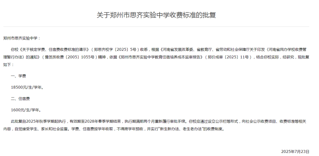 06郑州市思齐实验中学一、学费18500元/生/学年。二、住宿费1600元/生/学年。此批复自2025年秋季学期起执行,有效期至2028年春季学期结束,执行期满前两个月重新履行审批手续。学校应通过设立公示栏等形式,向社会公示收费项目、收费标准等相关内容,自觉接受学生、家长和社会监督。学费、住宿费按学年收取,不得跨学年预收,并实行“新生新办法、老生老办法”的收费制度。