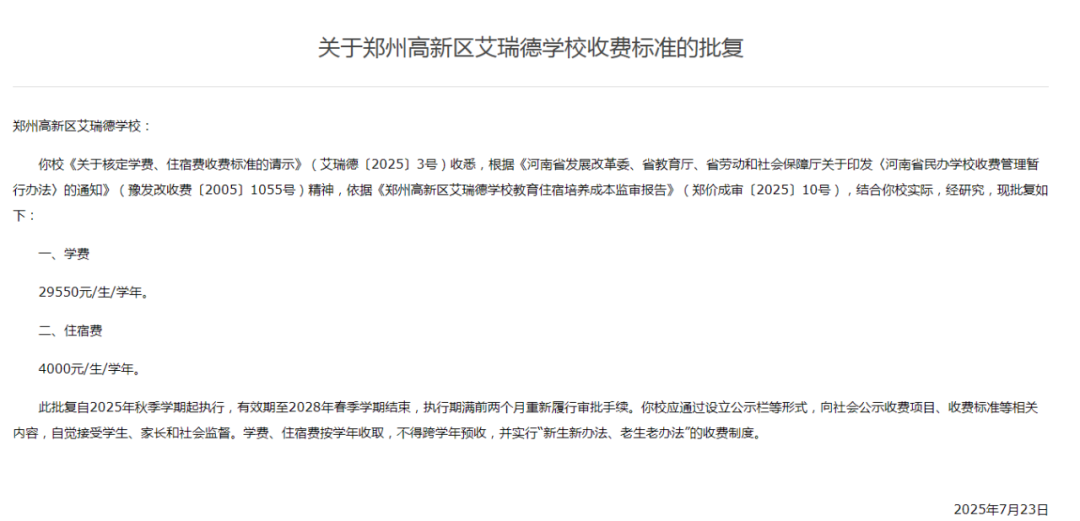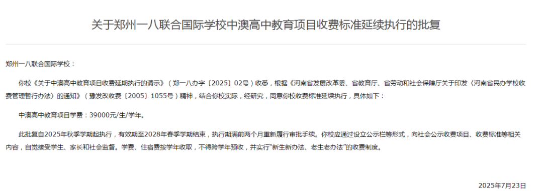 05郑州一八联合国际学校中澳高中教育项目中澳高中教育项目学费:39000元/生/学年。此批复自2025年秋季学期起执行,有效期至2028年春季学期结束,执行期满前两个月重新履行审批手续。学校应通过设立公示栏等形式,向社会公示收费项目、收费标准等相关内容,自觉接受学生、家长和社会监督。学费、住宿费按学年收取,不得跨学年预收,并实行“新生新办法、老生老办法”的收费制度。
