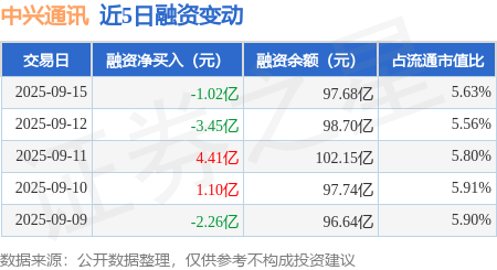 证券之星消息,9月15日,中兴通讯(000063)融资买入8.11亿元,融资偿还9.13亿元,融资净卖出1.02亿元,融资余额97.68亿元,近20个交易日中有12个交易日出现融资净买入。