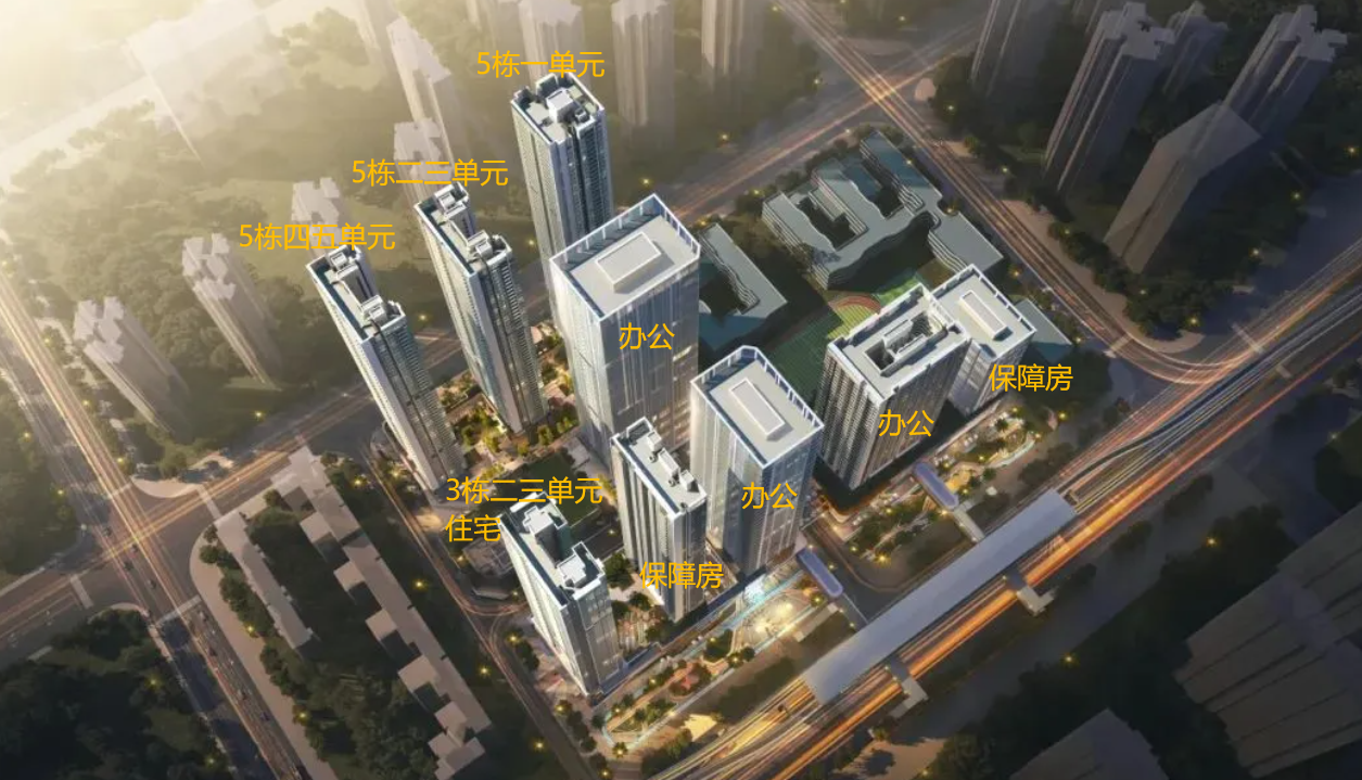 项目总占地面积约3.5万平方米,总建面约55万平方米,共由四栋54-64层的超高层住宅、两栋保障性住房、三栋办公楼组成,另外配建一所12班幼儿园。