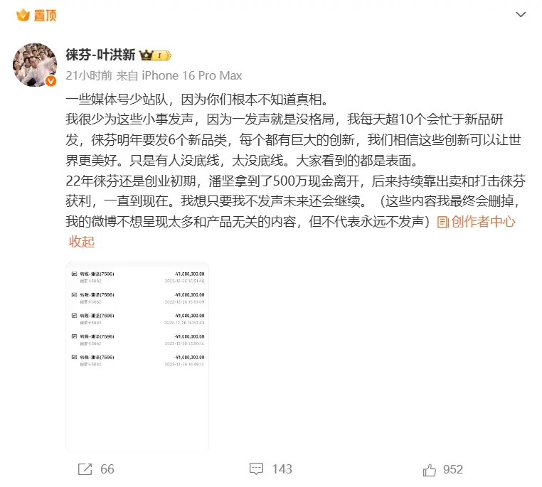 叶洪新在文中提及,潘坚因对公司新媒体业务有贡献,在2022年拿了500万元离职。双方在2023年还有合作,后因“潘坚勾结徕芬内部员工,一期0成本内容合作,但对公司报价50万元(已收款),被公司发现后才永久解除合作”,并称“掌握录音证据,视情况公开”。