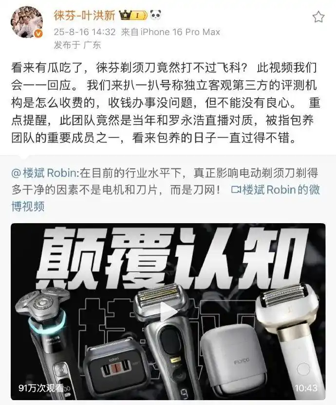 这场测评争议的背后,是叶洪新与潘某长期积累的矛盾爆发,及商业竞争的压力。从企业层面看,这场冲突的本质是徕芬与飞科在个护电器领域的正面交锋。