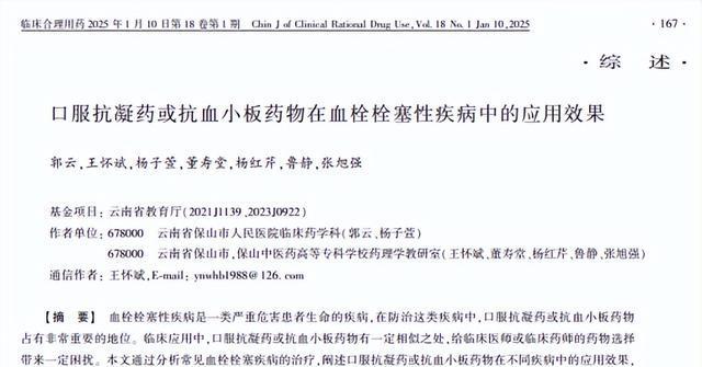 口服抗凝药或抗血小板药物在血栓栓塞性疾病中的应用效果,郭云;王怀斌;杨子萱;董寿堂;杨红芹,临床合理用药,2025-01-08