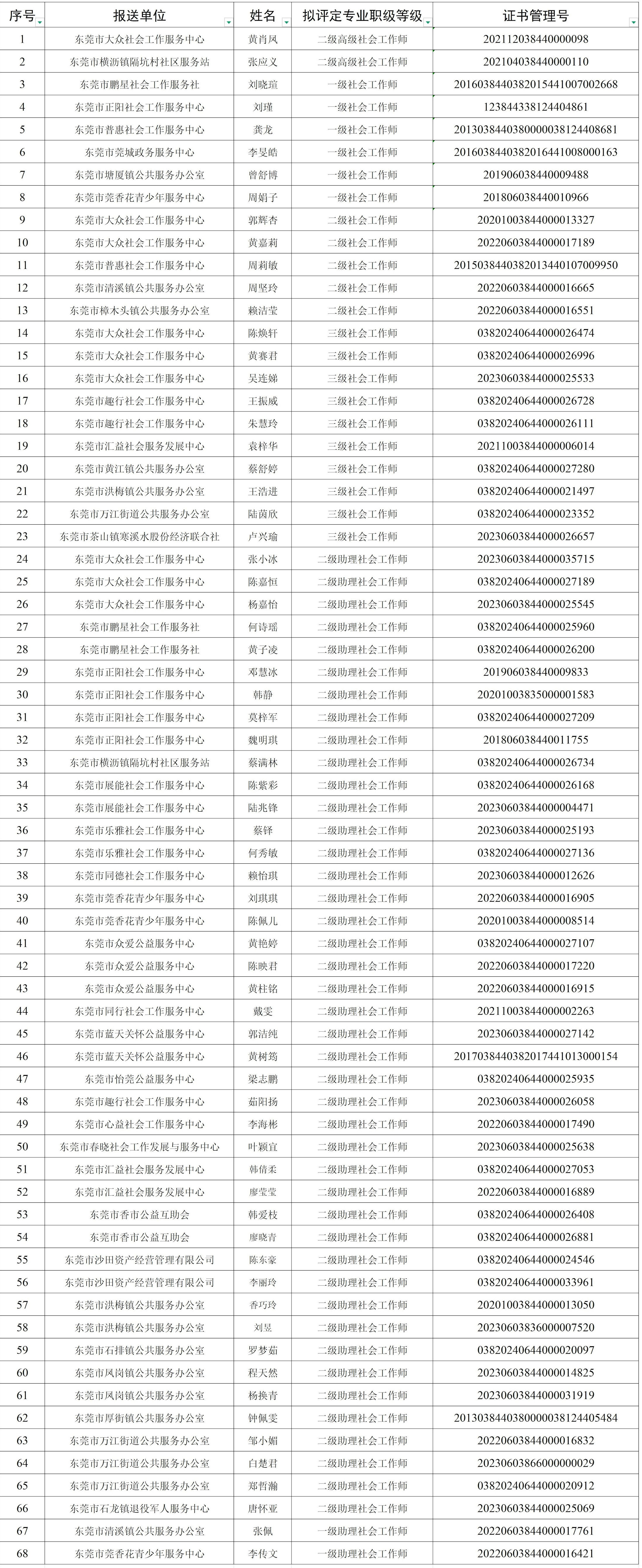 根据《东莞市社会工作专业职级管理办法》《关于开展2025年度社会工作专业职级评定工作的通知》要求,东莞市委社会工作部对有关单位推报的社会工作专业职级等级进行了审核,现将结果予以公示。