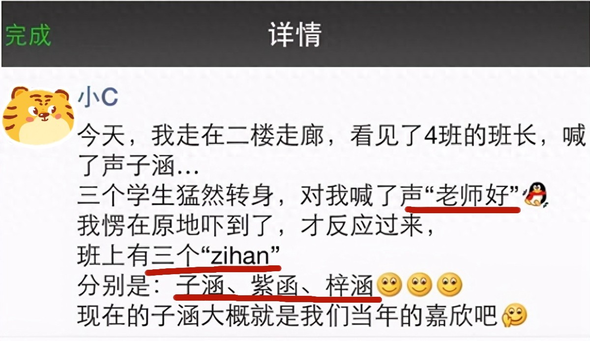 因为在同一个班里,可能有很多的“zi·han”,比如“子涵”、“子晗”、“紫涵”还有“梓翰”等等,一时间“梓涵”就成了“烂大街的名字”,引起了不少家长的注意。