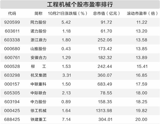 据证券时报·数据宝统计,A股中属于工程机械细分行业的个股共有35只。从估值上来看,剔除负值后工程机械个股滚动市盈率中位数为41.2倍,12股估值较低,市盈率不超过20倍,包括同力股份、诺力股份、浙江鼎力等。