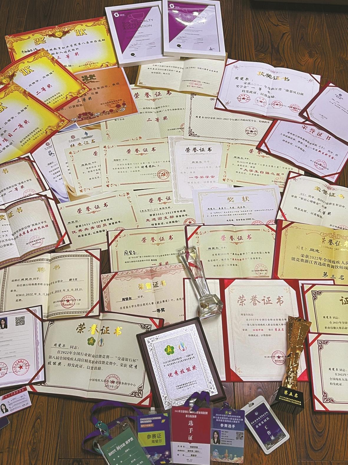大二和大三,是周斐尔在一次次竞赛中崭露头角的两年。全国残疾大学生创新创业大赛特等奖、浙江省国际大学生创新大赛金奖、浙江省大学生创业计划竞赛金奖……她和团队成员一起,带着《“云之南”无声咖啡学院》项目,斩获了一个又一个奖项。而她个人,还获得了全国技能大赛“咖啡冲调”项目第五名、全国残疾人岗位精英技能竞赛“调饮师”项目第九名等成绩。