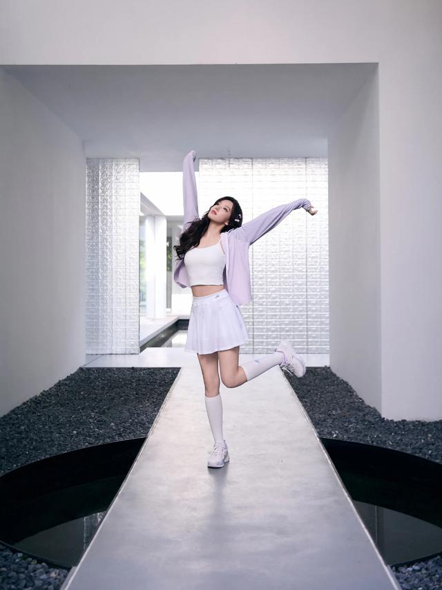 白色的短腿袜,白色的鞋子,全身都是白色的。在白色的空间里更加显得熠熠生辉,尽管程潇的肤色白皙,在白色着装衬托下显得有些暗淡,但依旧无法遮掩她的美丽。