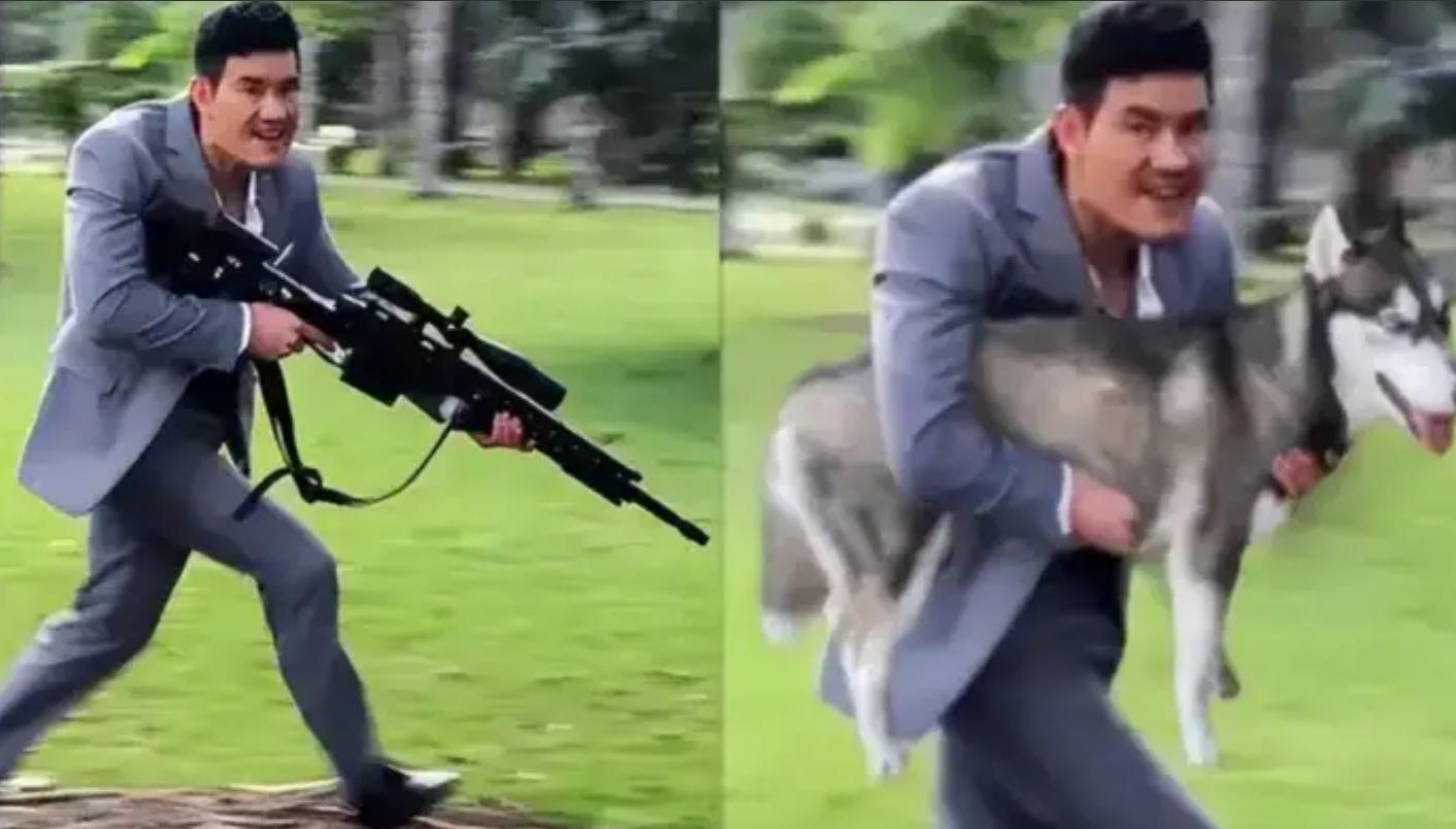 更有网友把他手里的枪给换成了小狗,瞬间火出了圈。