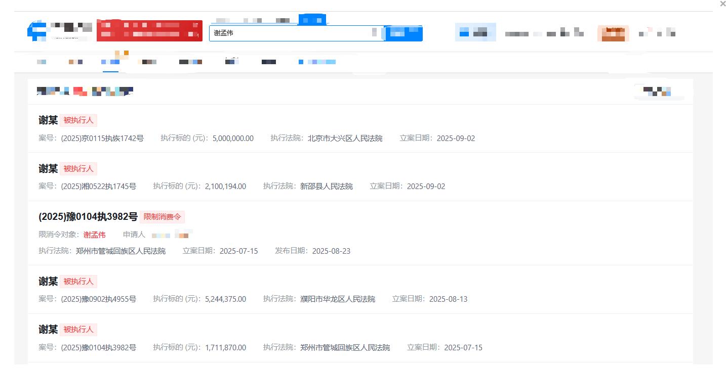随着而来的还有几条被执行人信息,显示谢孟伟之前多次与民间借贷纠纷,累计被执行金额超1400万元。
