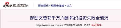 新浪娱乐|郝劭文曾获千万片酬 妈妈投资失败全泡汤