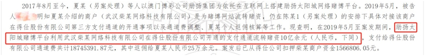 从2019年5月后的一年多时间,励扬太阳城赌博平台的赌资,便通过这条通道流转,金额超过10亿元人民币。而得仕股份也因此获得高达1874.54万元的通道费。