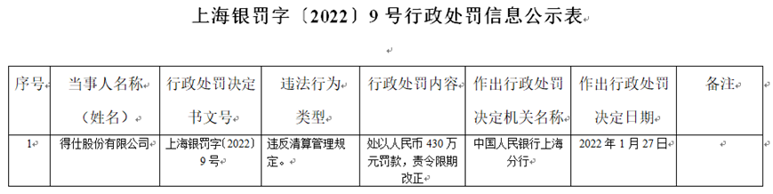 次年2月,得仕股份还因违反清算管理规定,被央行上海分行处以430万元罚款,责令限期改正。