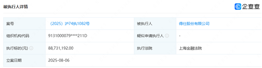 企查查显示,2025年8月6日,得仕股份被上海金融法院立案执行,执行标的为8873.1192万元。