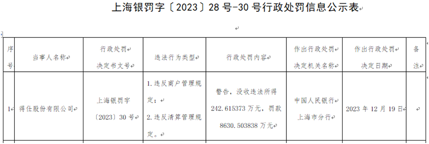 2023年12月,央行上海市分行披露的行政处罚信息显示,得仕股份因违反商户管理规定、违反清算管理规定被警告,合计遭罚没8873.1192万元。