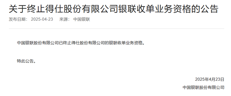 2025年4月,中国银联宣布终止得仕股份的银联收单业务资格。