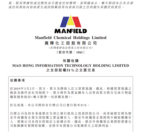 2019年3月,万辉化工(后改称:联洋智能控股)发布公告称,拟通过全资子公司Pan Asia Data(BVI)Inc.以7.9亿港元,向Mao Hong Holding Limited收购Mao Hong Information Technology Holding Limited(下称“目标公司”)51%股权。