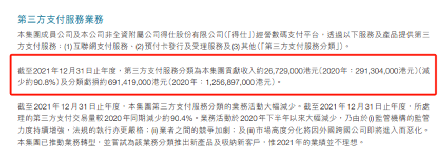 至2024年,其支付服务业务营收进一步萎缩至约115.90万港元,同比减少约45.8%;分类亏损1.04亿港元。
