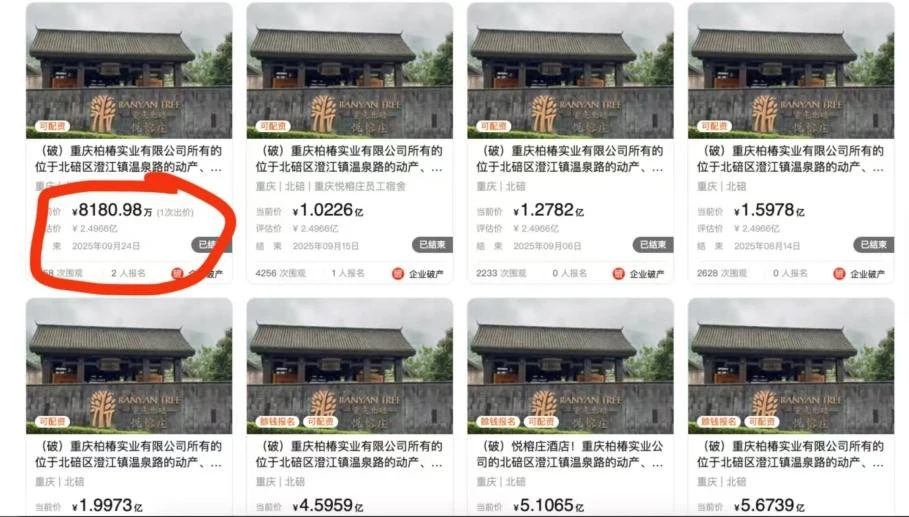 上个月24号,拥有停机坪和温泉的重庆顶奢酒店北碚悦榕庄,历经10次挂牌,拍卖价一直从7亿降到8千万才卖出去。