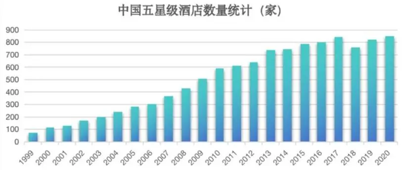 过去20年,是城市化和地产的黄金时代,作为相关产业的酒店也因此进入了疯狂扩张期,五星级酒店的数量翻了8倍,其他酒店数量也是逐年成倍增长。