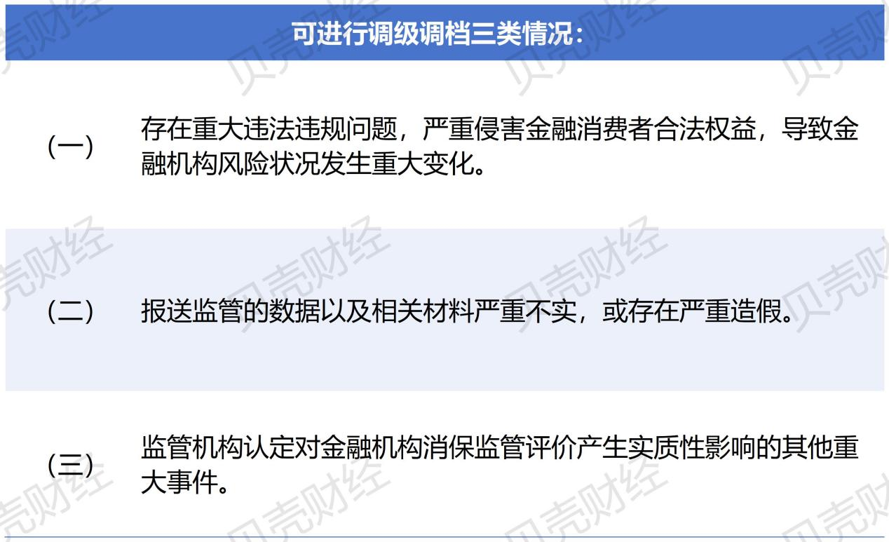 此外,评价工作结束后,若发现被评价金融机构在评价年度内存在以下三类情况的(如下图所示),金融监管总局及其派出机构可视情形对消保监管评价结果进行调级调档,派出机构应将调整情况逐级报送上级监管机构。