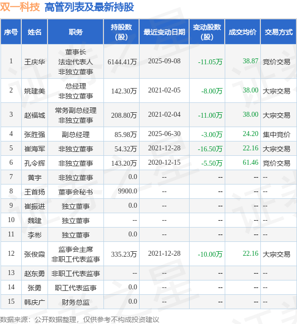 双一科技的高管列表及最新持股情况如下: