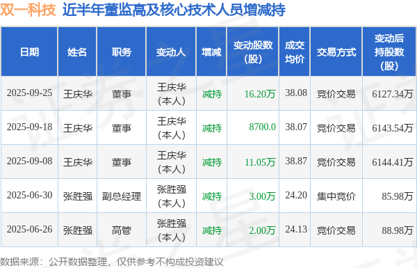 双一科技近半年内的董监高及核心技术人员增减持详情如下: