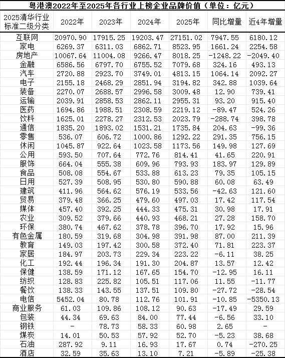 数据显示,互联网行业品牌价值位居第一,高达27151.02亿元,且远超其他行业;家电行业位居第二,品牌价值在2025年实现大幅增长,同比增加1661.24亿元;房地产行业位居第三,但品牌价值呈下滑态势,近4年降幅超2000亿元。此外,凭借比亚迪等新能源巨头,粤港澳的汽车行业近4年品牌价值增量超2000亿元。