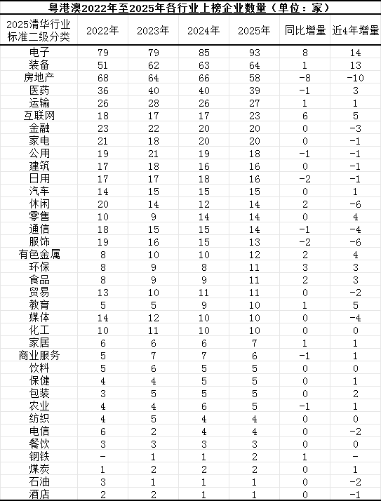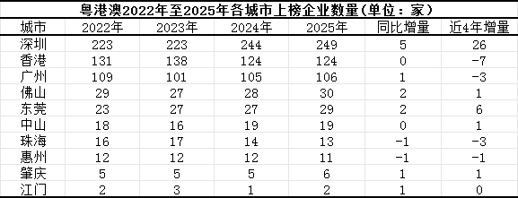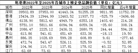 从城市维度看,深圳上榜企业的数量与合计品牌价值均第一,且较其他城市显著领先。从动态角度看,2022年至2025年,深圳上榜企业数量增长26家,合计品牌价值增长11752.39亿元,两项增量指标也均位列区域第一。