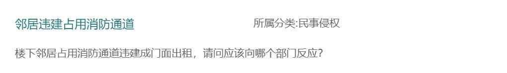 A3:占用消防通道和违建门面属违法行为,可以分别向消防部门和城管部门投诉反映。