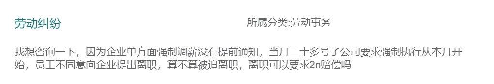 我想咨询一下,因为企业单方面强制调薪,没有提前通知,当月二十多号公司要求强制执行,从本月开始。员工不同意,向企业提出离职,算不算被迫离职?离职可以要求2N赔偿吗?