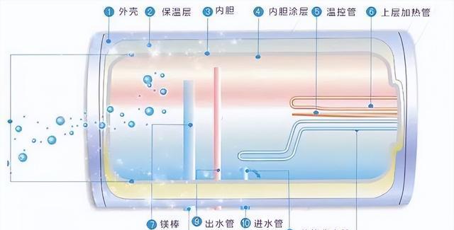 现在我们所购买的热水器当中基本都会安装两个加热棒,两个加热棒是处于上下排列的状态,而且热水器里面有一个出水口和一个进水口,进水口比较短,出水口比较长。
