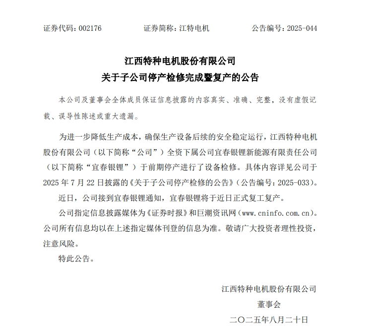 8月19日晚间,江特电机公告表示公司全资下属公司宜春银锂新能源有限责任公司于前期停产进行了设备检修。近日公司接到宜春银锂通知,宜春银锂将于近日正式复工复产。