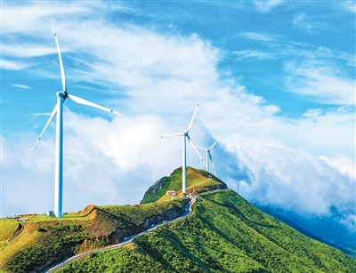 近年来,江西省赣州市上犹县推进风力、光伏等新能源发电项目建设,为经济社会发展注入绿色动力。图为上犹县双溪草山,一台台风力发电机迎风旋转。