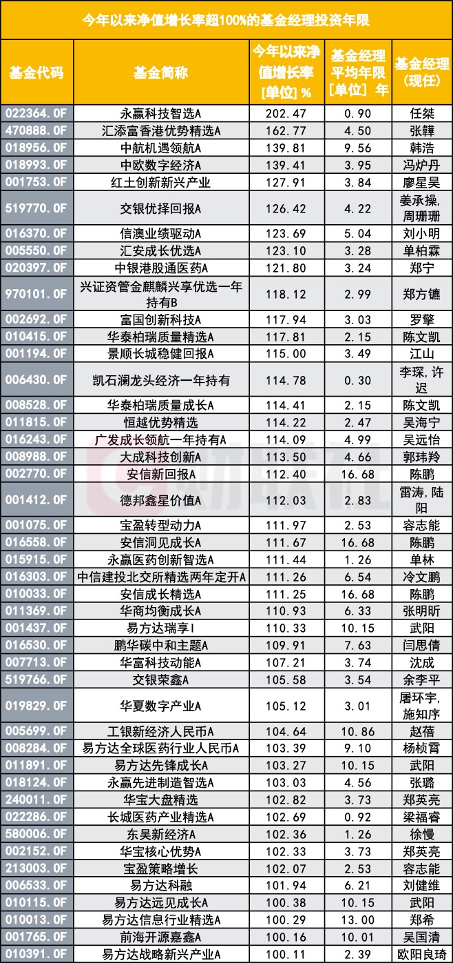 当然,这一趋势也并非绝对。年内收益表现靠前的队伍中,仍可见数位有着十年以上投资经验的老将坐镇,他们依然能在风格转向、行业轮动中游刃有余。如陈鹏管理的安信洞见成长、赵蓓的工银新经济、武阳的易方达先锋成长、易方达远见成长等,年内基金净值增长率均超100%,这些基金经理投资年限都在10年以上。