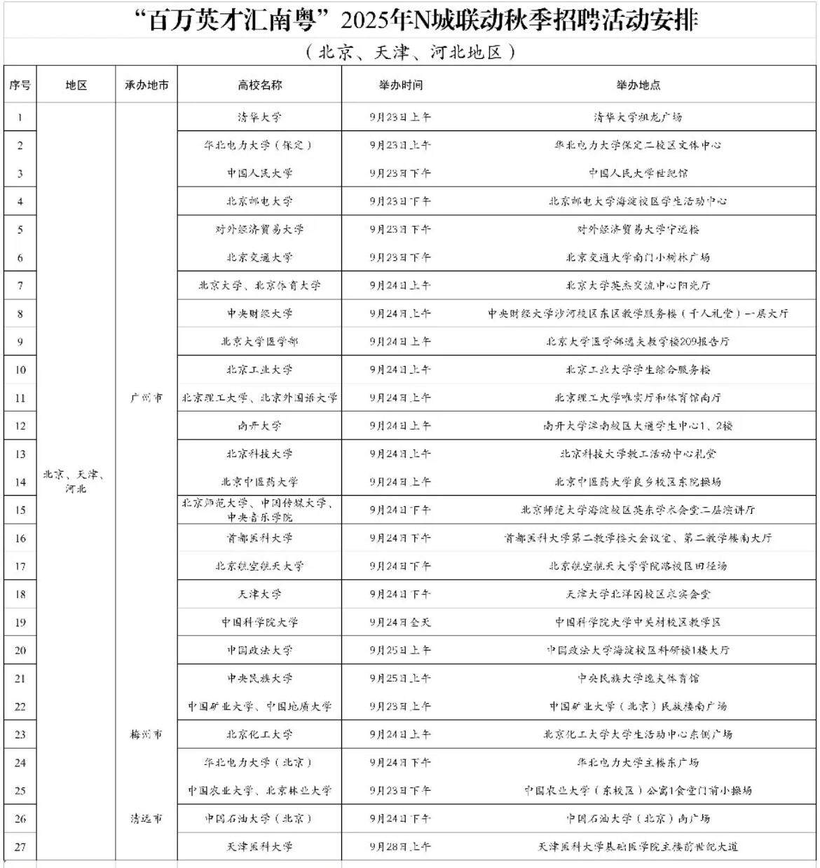 “百万英才汇南粤”2025年N城联动秋季招聘活动将于9月下旬正式启动,京津冀地区高校站作为本次活动的“头炮”,由广州、清远、梅州三市共同承办。