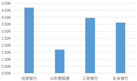 在这样的市场风格和共识下,成都银行的股价是否还有进一步上涨的空间呢?数据显示,截至日前,成都银行的股息率高达4.68%,远高于当前10年期国债到期收益率(1.69%),同时也高于此轮红利行情的领跑者——五大行的股息率水平。例如,工商银行的股息率为3.95%,农业银行为3.61%。
