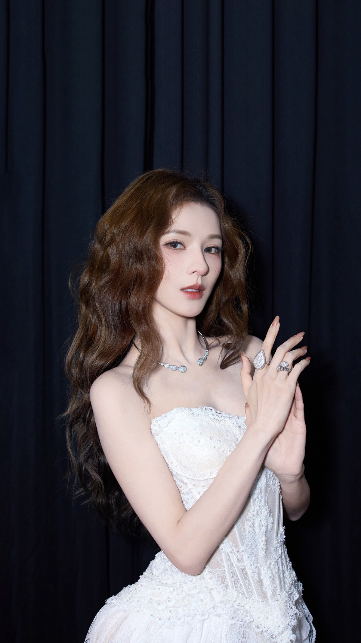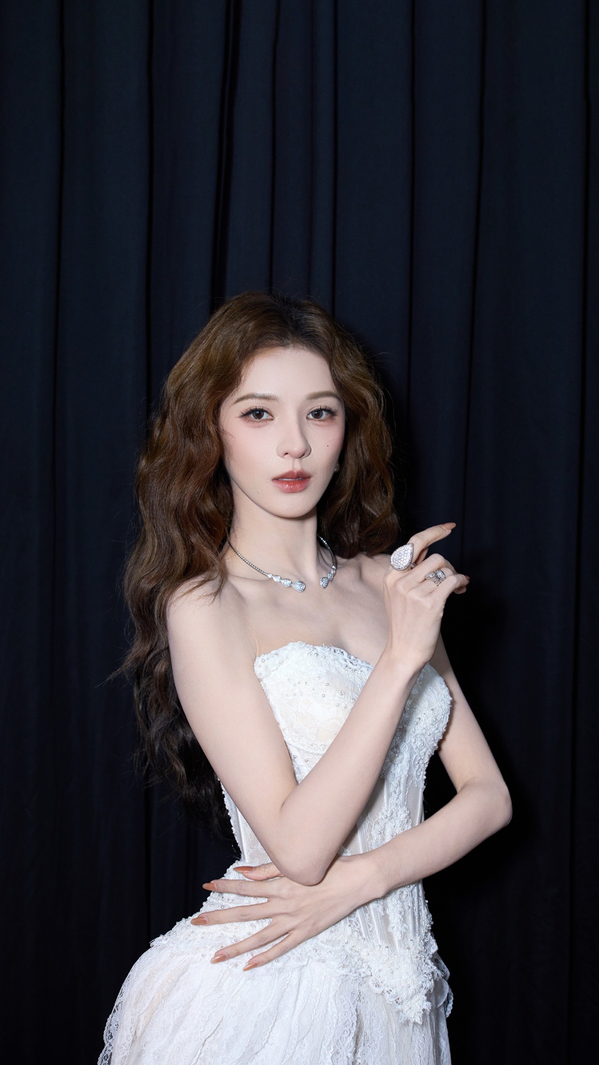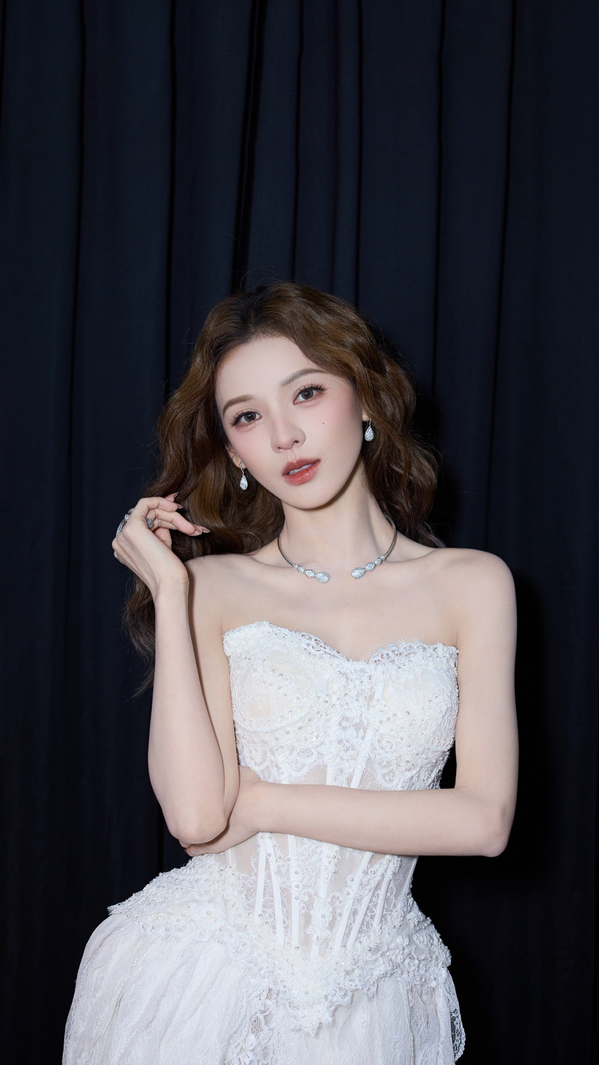再配上那璀璨的钻石珠宝,项链在颈间闪烁,耳环在耳畔摇曳,与白色蕾丝相互映衬,宛如夜空中最亮的星点缀在洁白的雪幕之上,增添了几分华丽与梦幻。