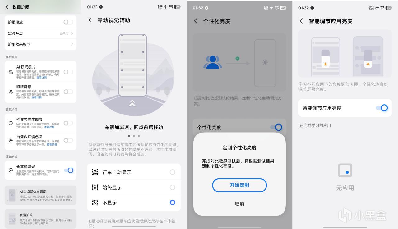 支持根据个人敏感度定制个性化亮度调光方案,支持智能调节应用亮度(根据不同应用平时用户的手动调节情况自学习)。
