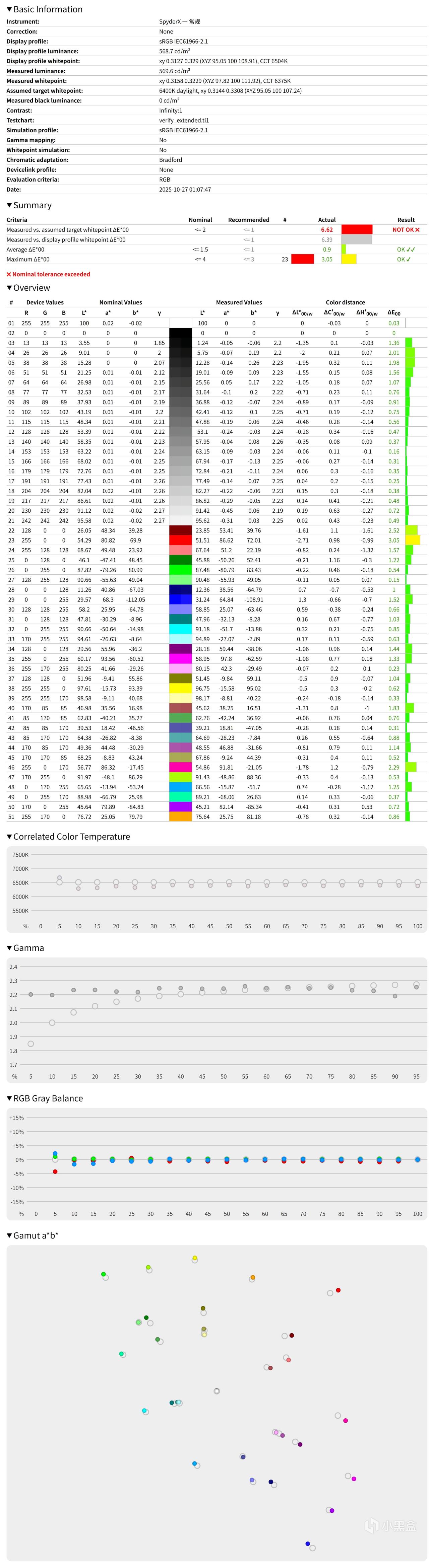 实测专业模式下,平均ΔE色准达到了0.9的优秀水平。