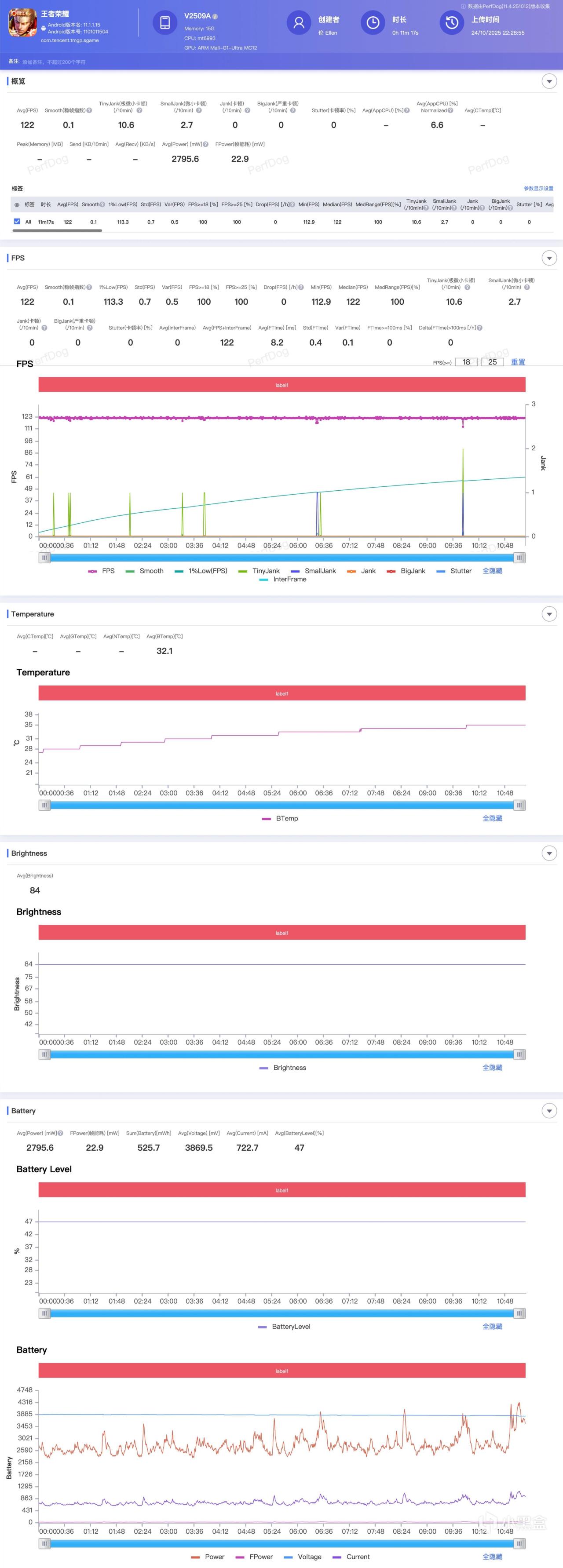 王者荣耀全高单局5v5,11分钟平均帧率直接拉到了122,未出现明显卡顿对于今天的旗舰来说是基本功。