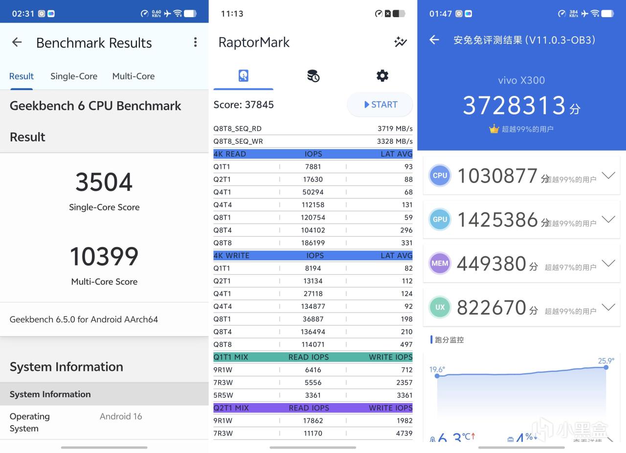 内存闪存采用了LPDDR5X Ultra + UFS4.1的组合。RaptorMark闪存测试得分37845,读取3719 MB/s,写入3328 MB/s。