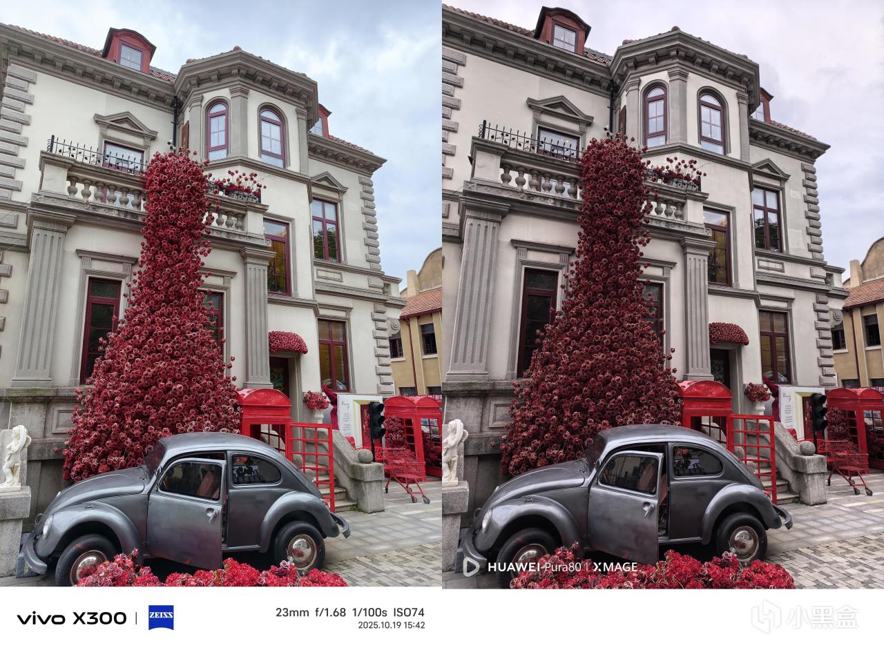 日间光看主摄,似乎我们还能用风格来解释——这组对比中,X300明显更加自然一些;Pura 80的经典味道用力过猛,使得观感有点奇怪。