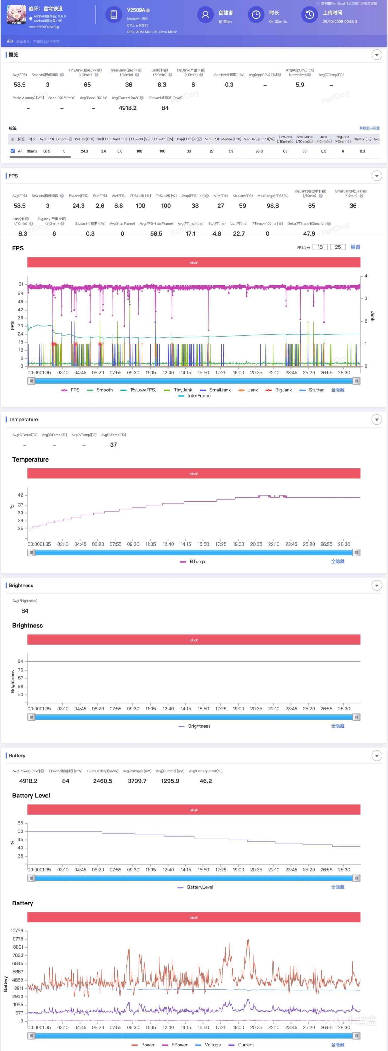 星穹铁道目前还是各家没能完全征服的游戏,X300经过30分钟后平均帧率58.5,和我之前对小米15测试成绩几乎一样,但整体卡顿次数少了不少——