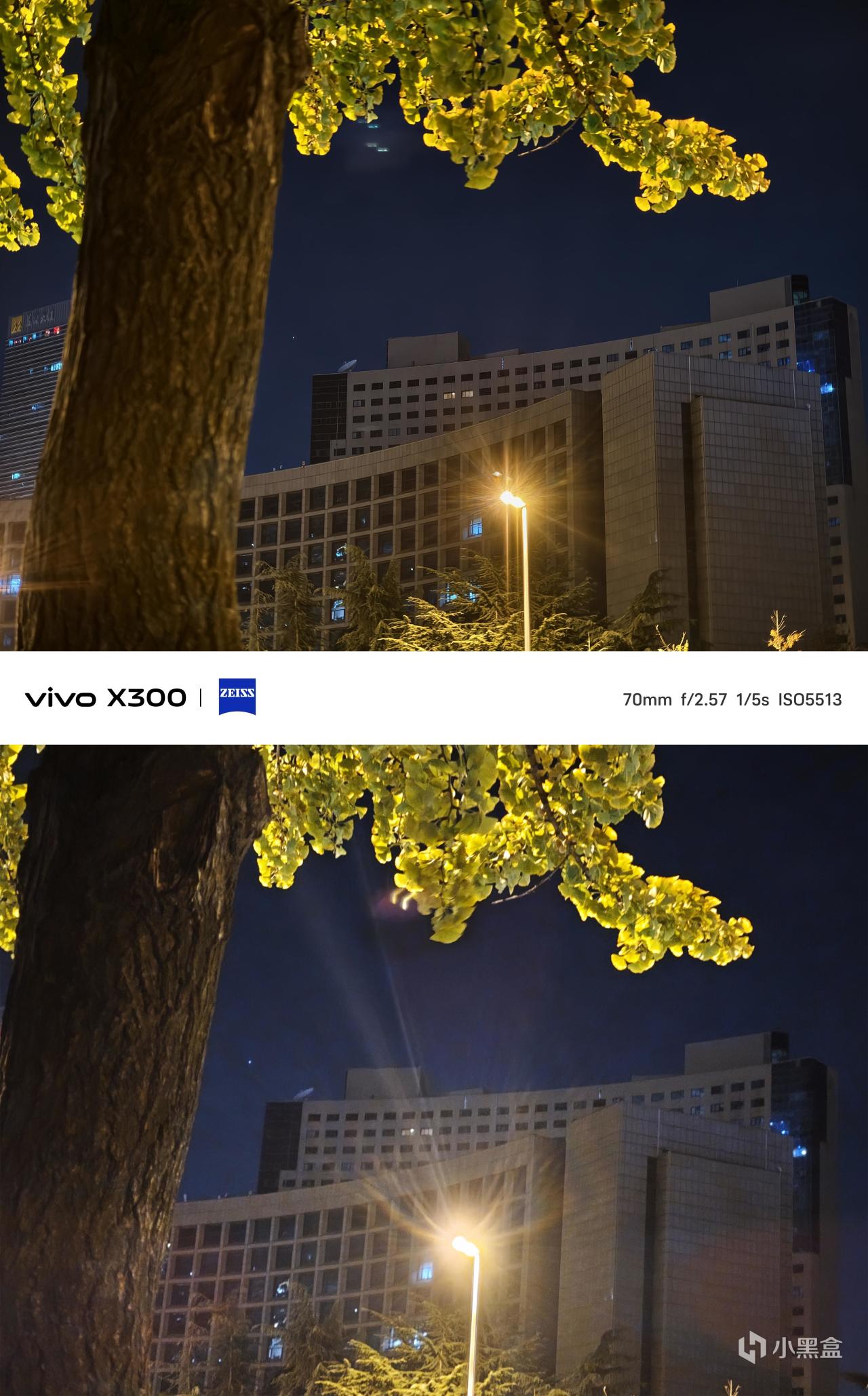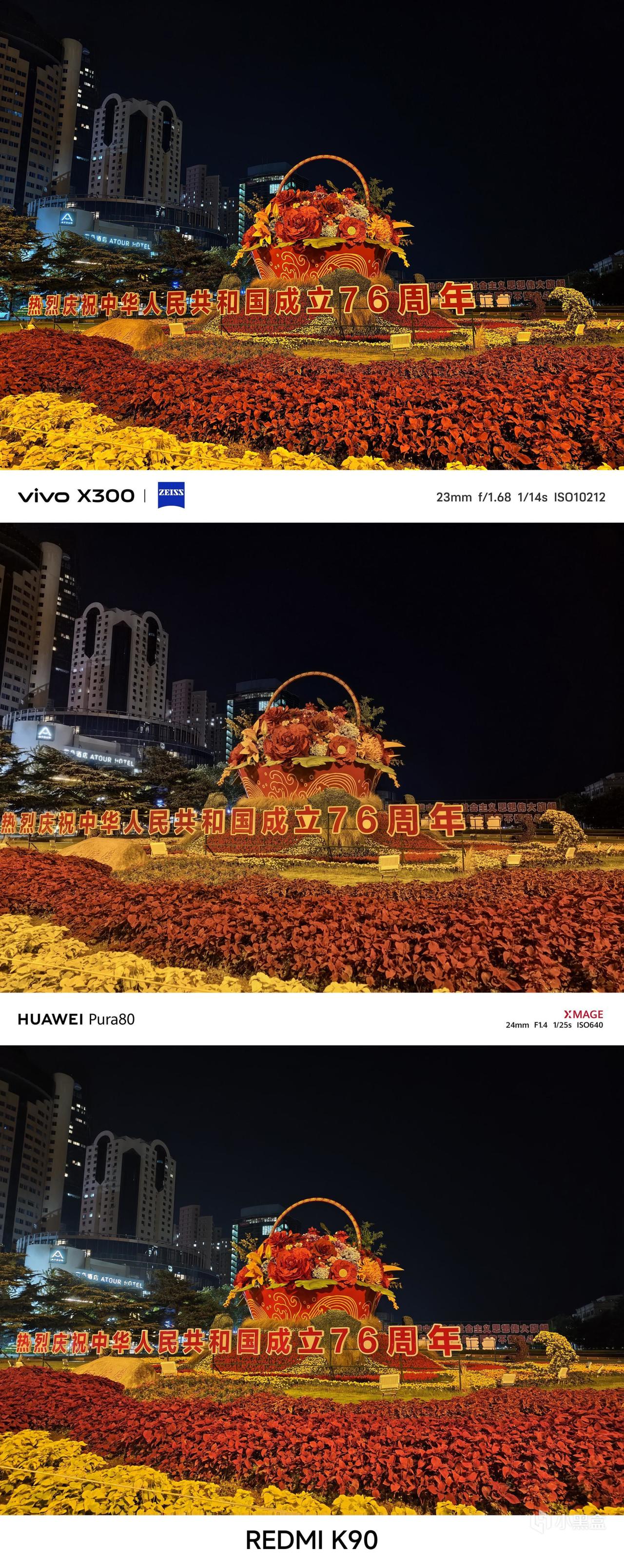 到了夜景,差距明显了些,vivo X300的色彩没有“发死”,但也不求过分的虚假浓艳;远处的高光不仅压制的最好,而且把灯源的颜色也保留了下来。
