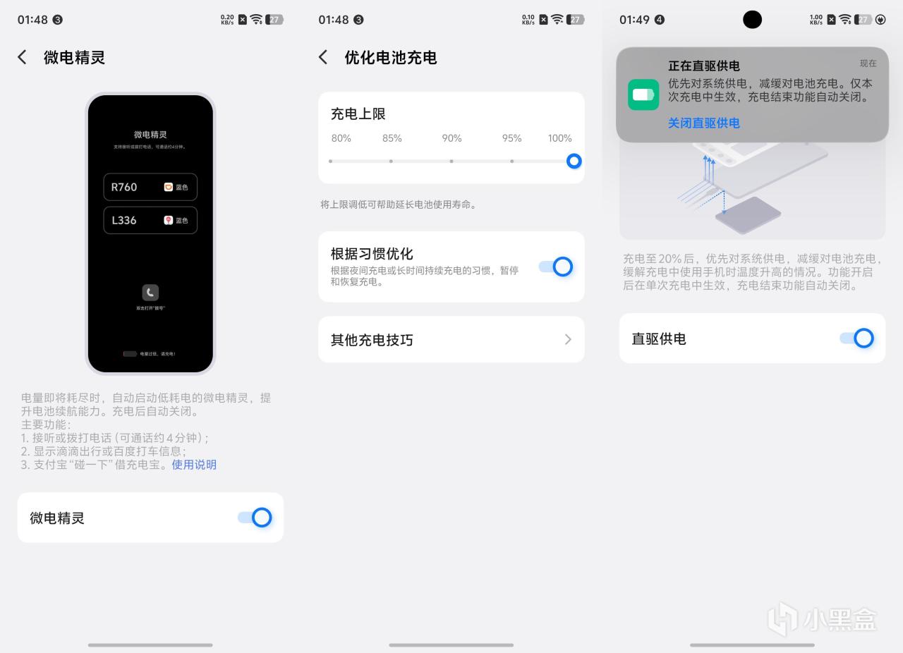 电池耗尽到1%后支持微电精灵,支持自定义80%~100%的充电上限和根据习惯优化,支持直驱供电。
