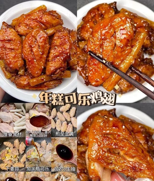 所需食材:鸡翅、年糕、料酒、姜片、可乐、生抽、蚝油、老抽。