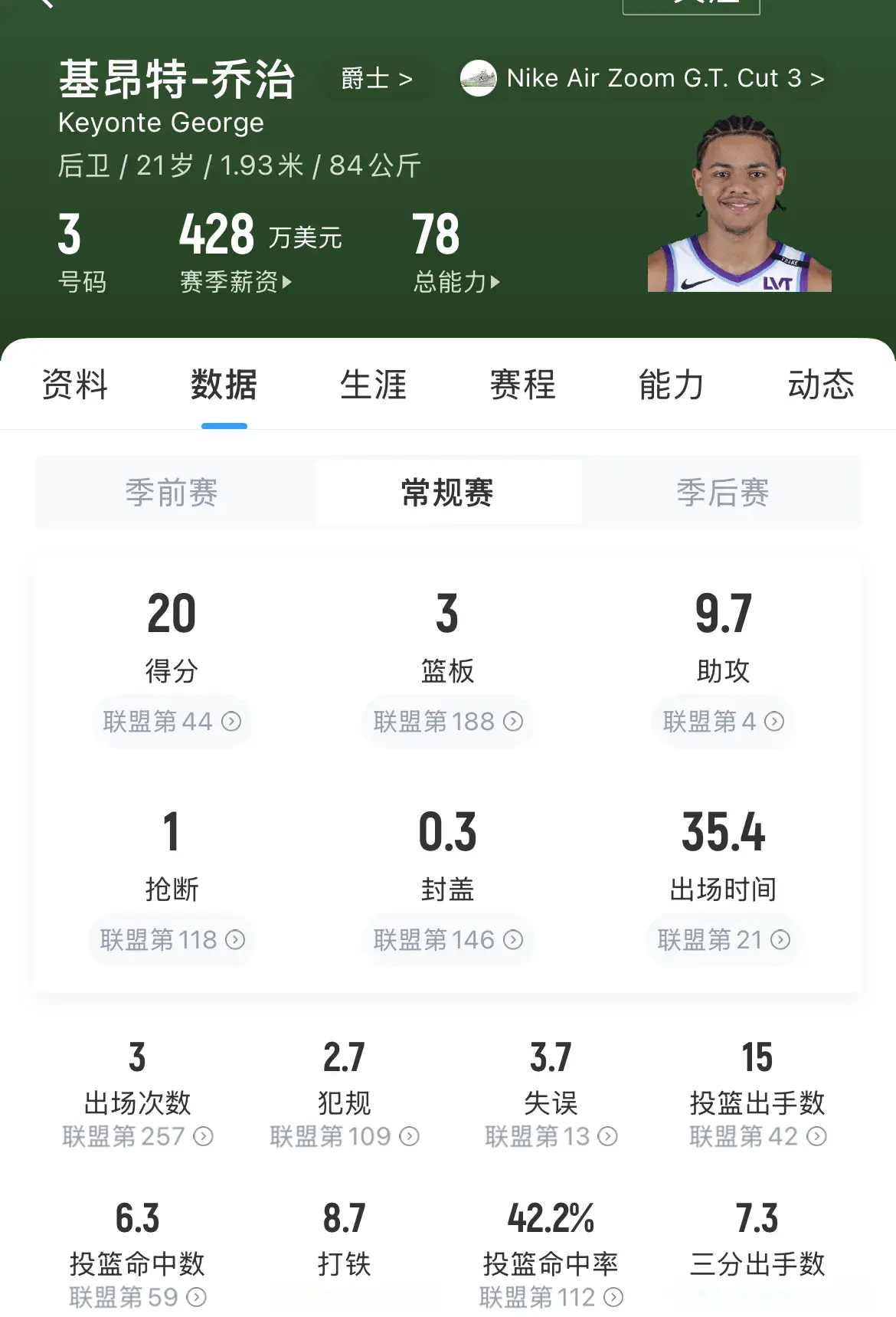 第5给乔治!看看乔治的数据,20分9.7助攻,绝对的巨星苗子来了!他在自己的第3个赛季打出了全明星的水准!