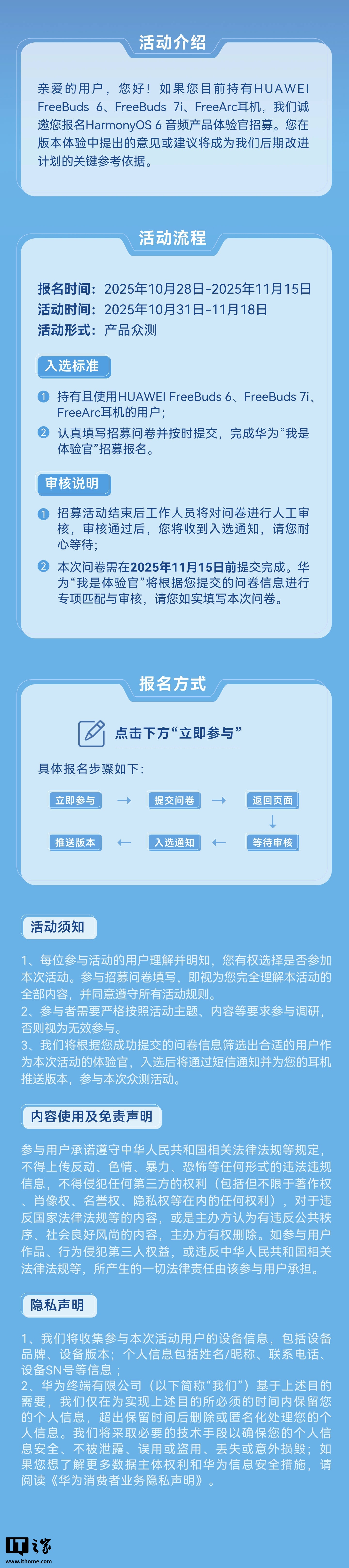 IT之家整理活动重点内容如下(活动路径:我的华为-首页-活动-体验官-HarmonyOS 6 音频产品体验官招募):