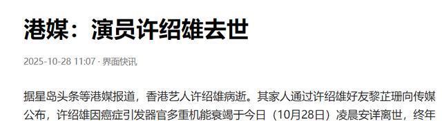 香港著名演员许绍雄去世了,享年76岁。
